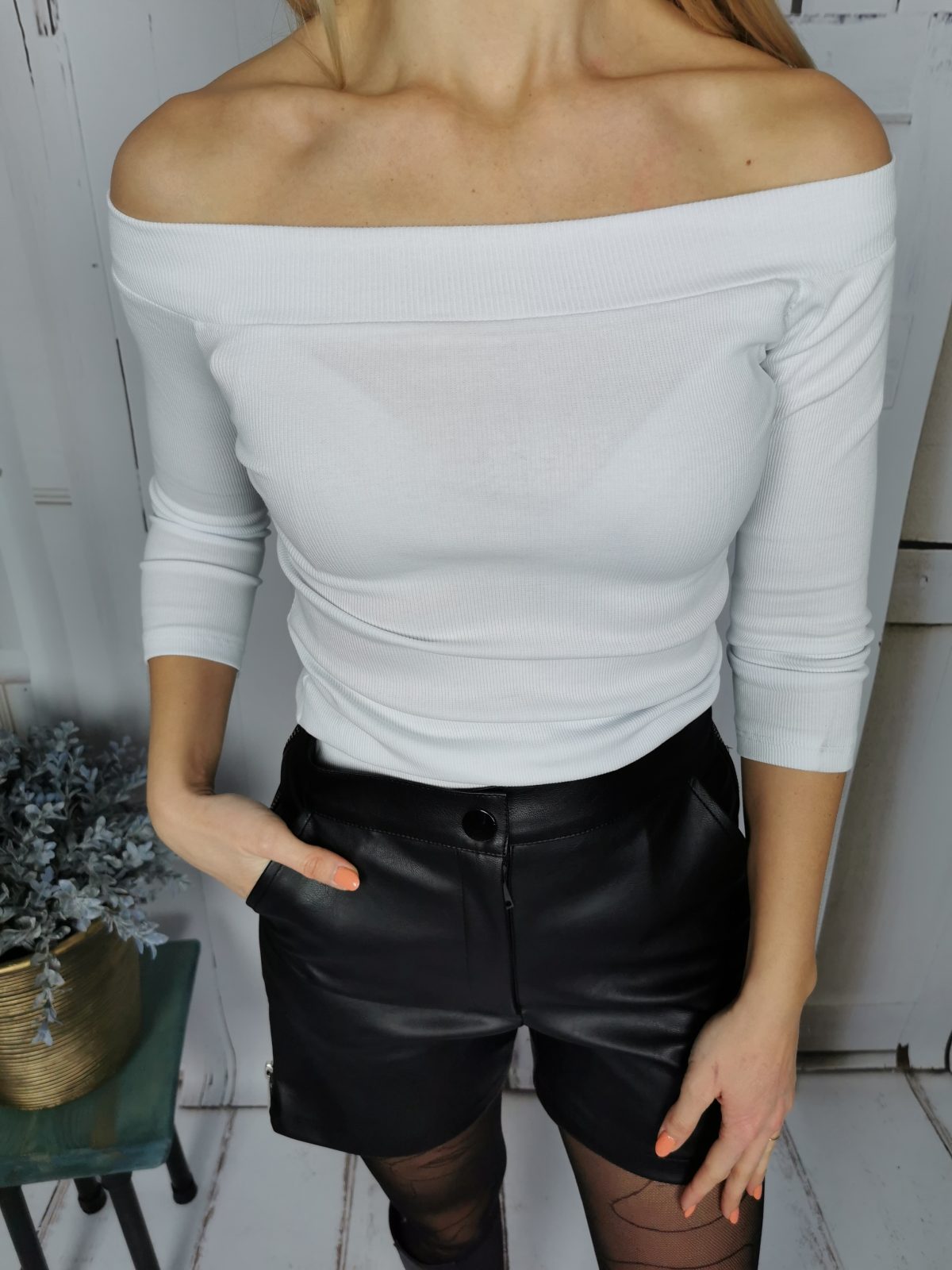 Klasyczna bluzka z prążkowanej dzianiny. Typowy Basic dla wielu stylizacji. Dekolt hiszpanka doskonale podkreślający ramiona.