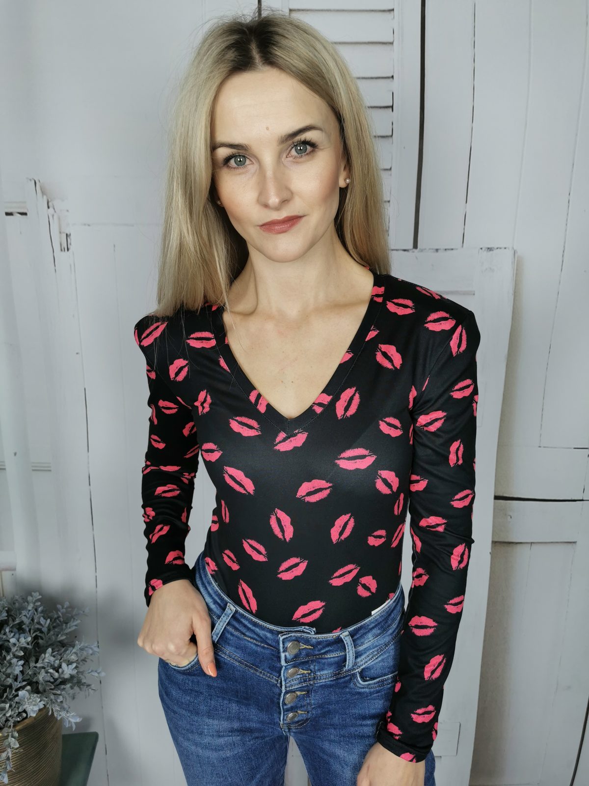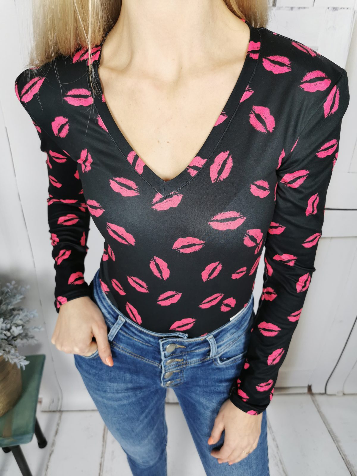 Czarne body, wzór różowe usta. Body zapinane na dwa guziki, dekolt w literę V. Posiadają wszyte poduszki na ramionach, można je samemu usunąć jeśli nie lubisz takich dodatków. Body pięknie przylegają do ciała, oryginalne od polskiego producenta.