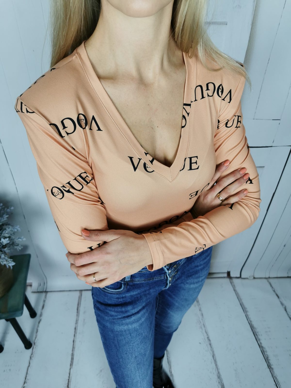 Piękne, kobiece body w kolorze cielistym z napisem logowanym producenta oraz VOGUE. Body zapinane na dwa guziki, dekolt w literę V. Posiadają wszyte poduszki na ramionach, można je samemu usunąć jeśli nie lubisz takich dodatków. Body pięknie przylegają do ciała, oryginalne od polskiego producenta.