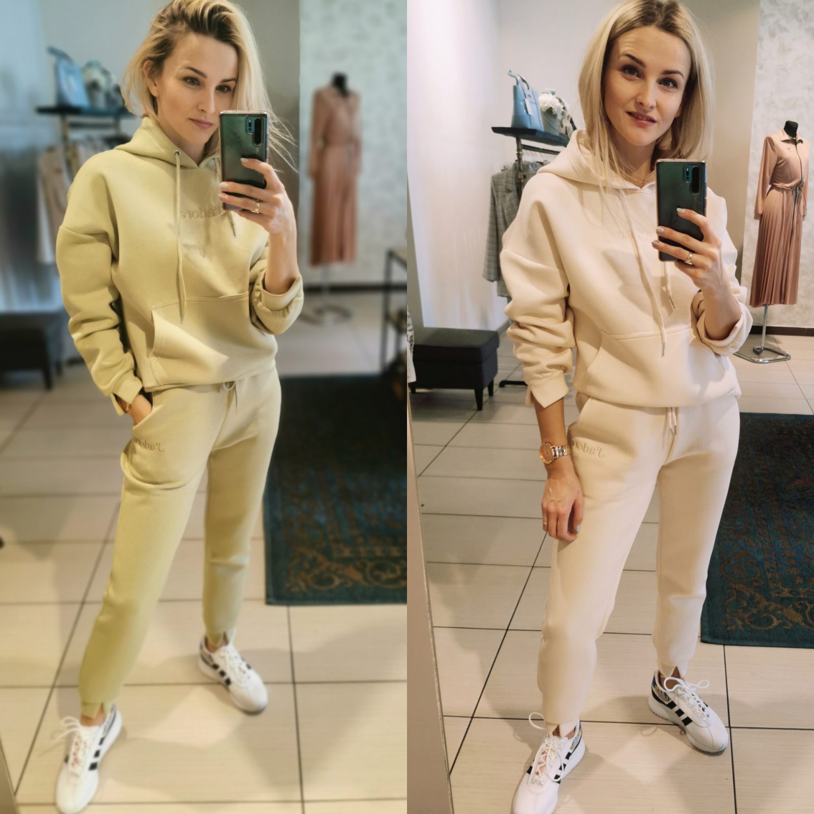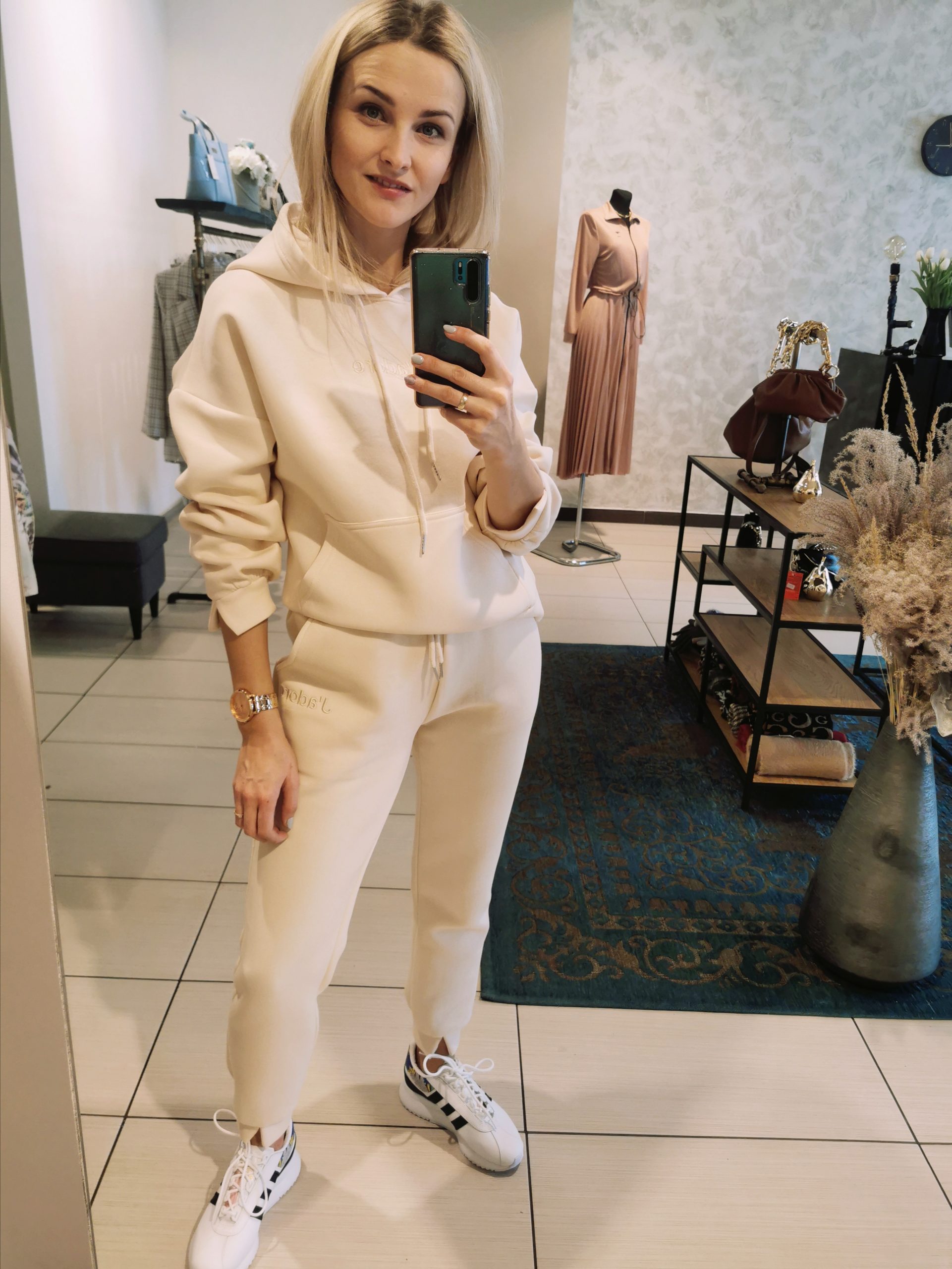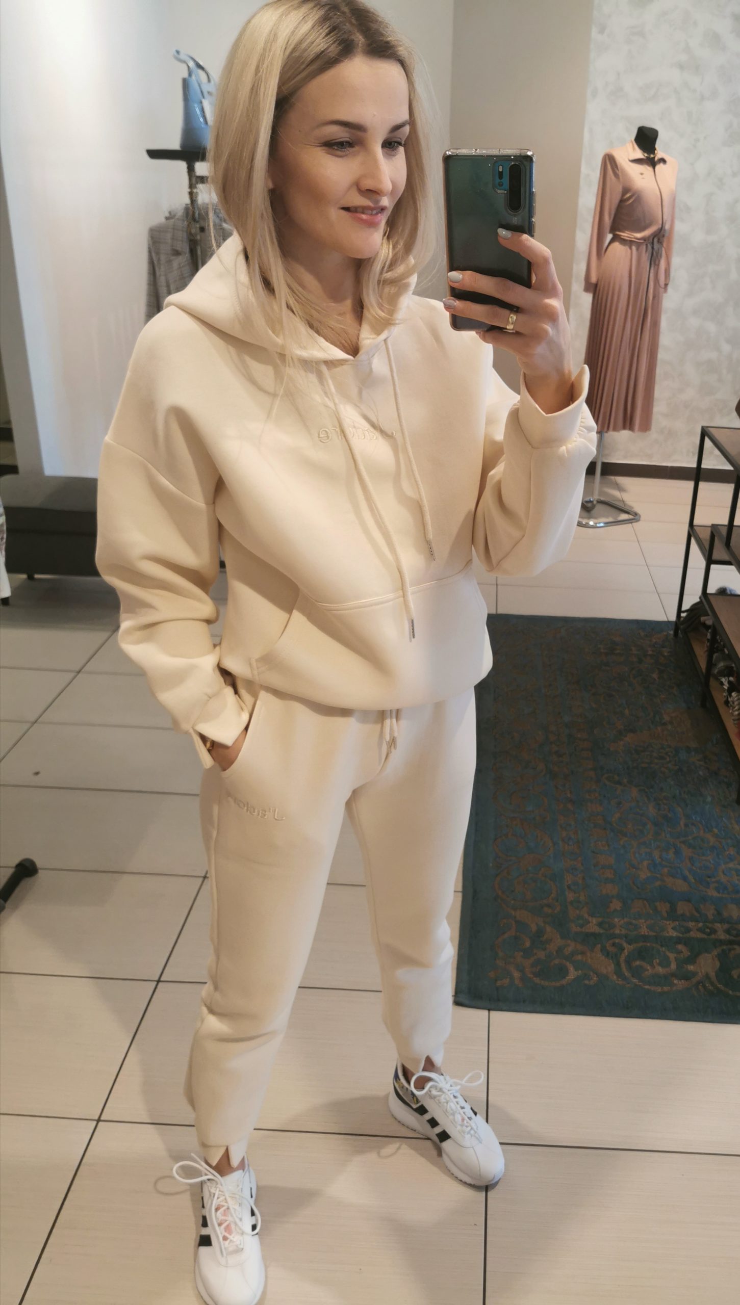 Bawełniany komplet dresowy w kolorze ecru. Bluza z przodu posiada kieszeń a’la kangurka, kaptur ściągany sznurkiem. Rękaw reglan. Dodatkowo na piersi wyszyty napis J’ADORE . Delikatną ozdobą rękawów w bluzie jest subtelne rozcięcie mankietu. Spodnie na szerokiej gumie w pasie z dodatkowym sznurkiem, kieszenie klasyczne. Nogawki również posiadają rozcięcie mankietu.