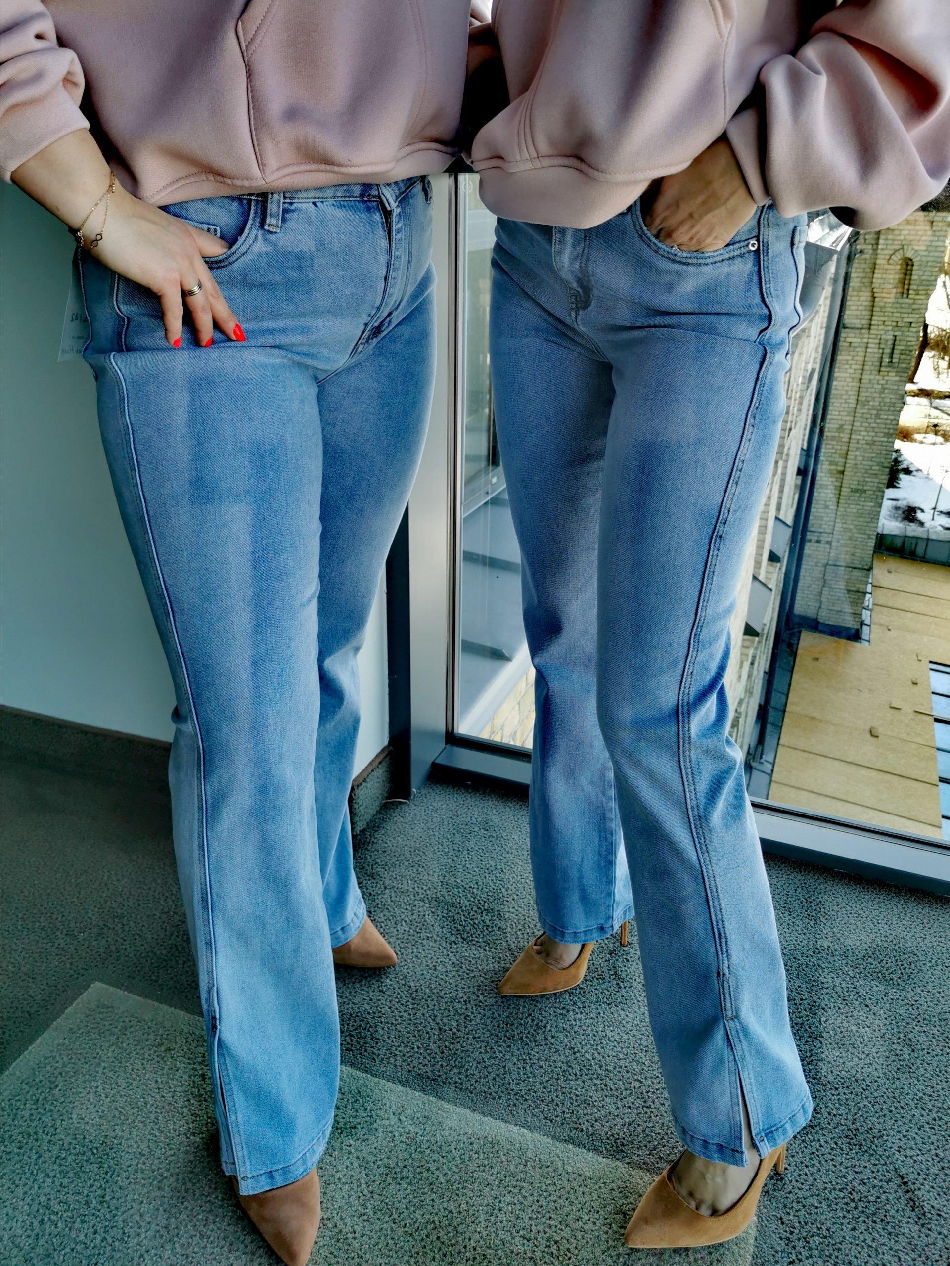 Ten model to MUST HAVE tego sezonu! Posiadają wyższy stan, nogawka delikatnie rozszerzana ku dołowi. Piękne wykończenie z delikatnym rozcięciem na dole nogawki, dwie kieszenie z przodu i z tyłu. Trendy i pięknie wydłużające sylwetkę! Idealne do sportowych stylizacji oraz do szpilki.
