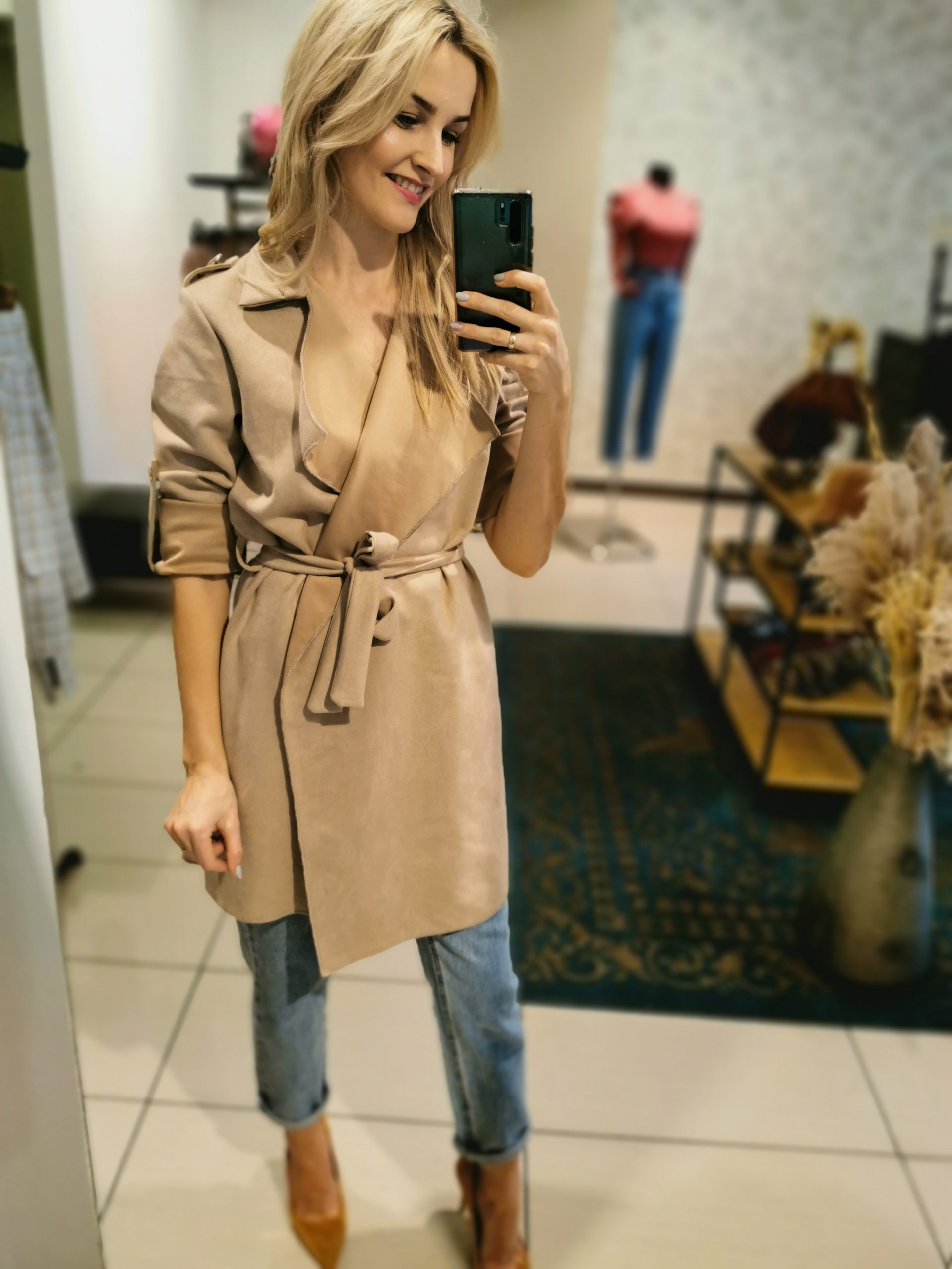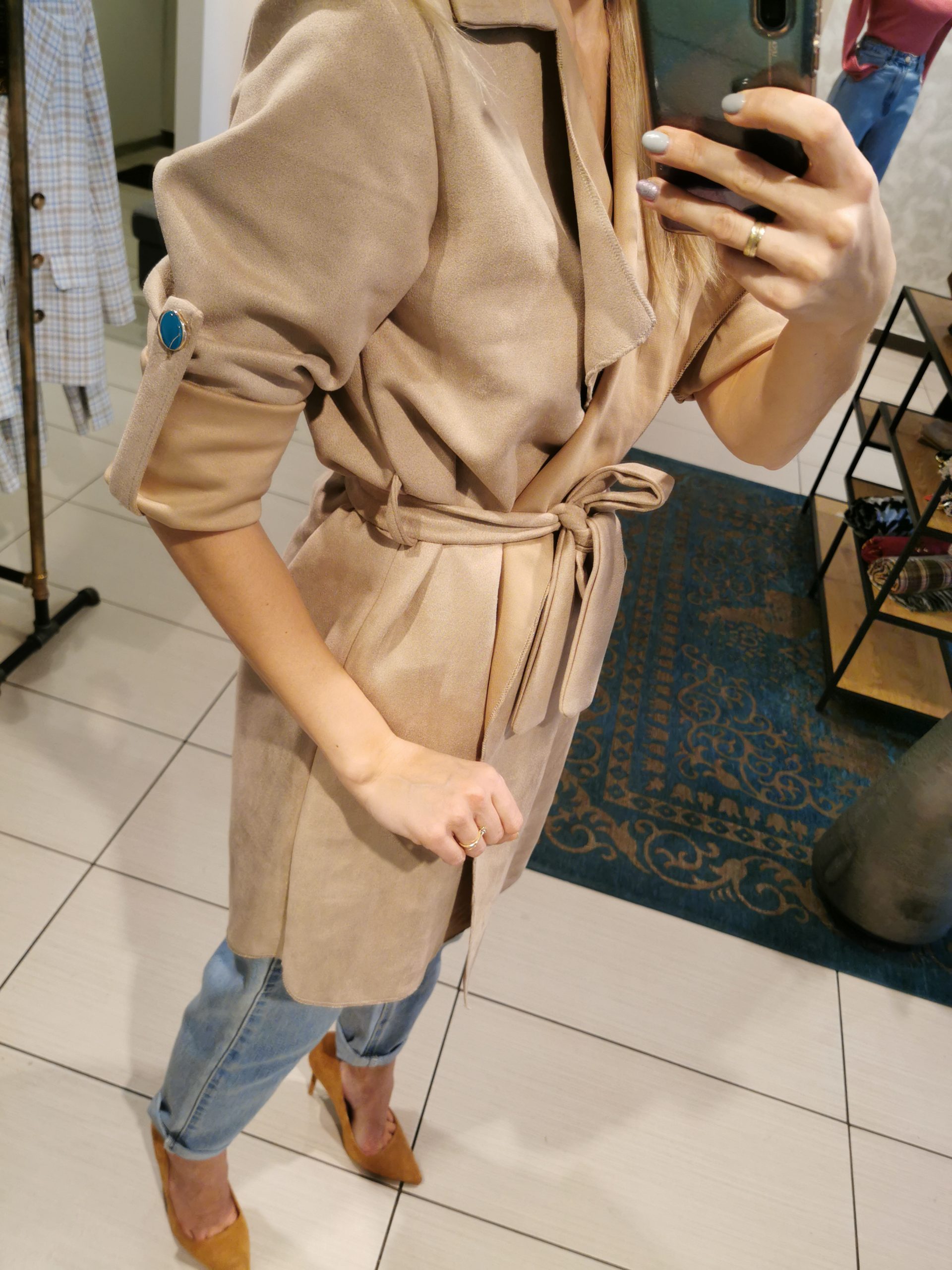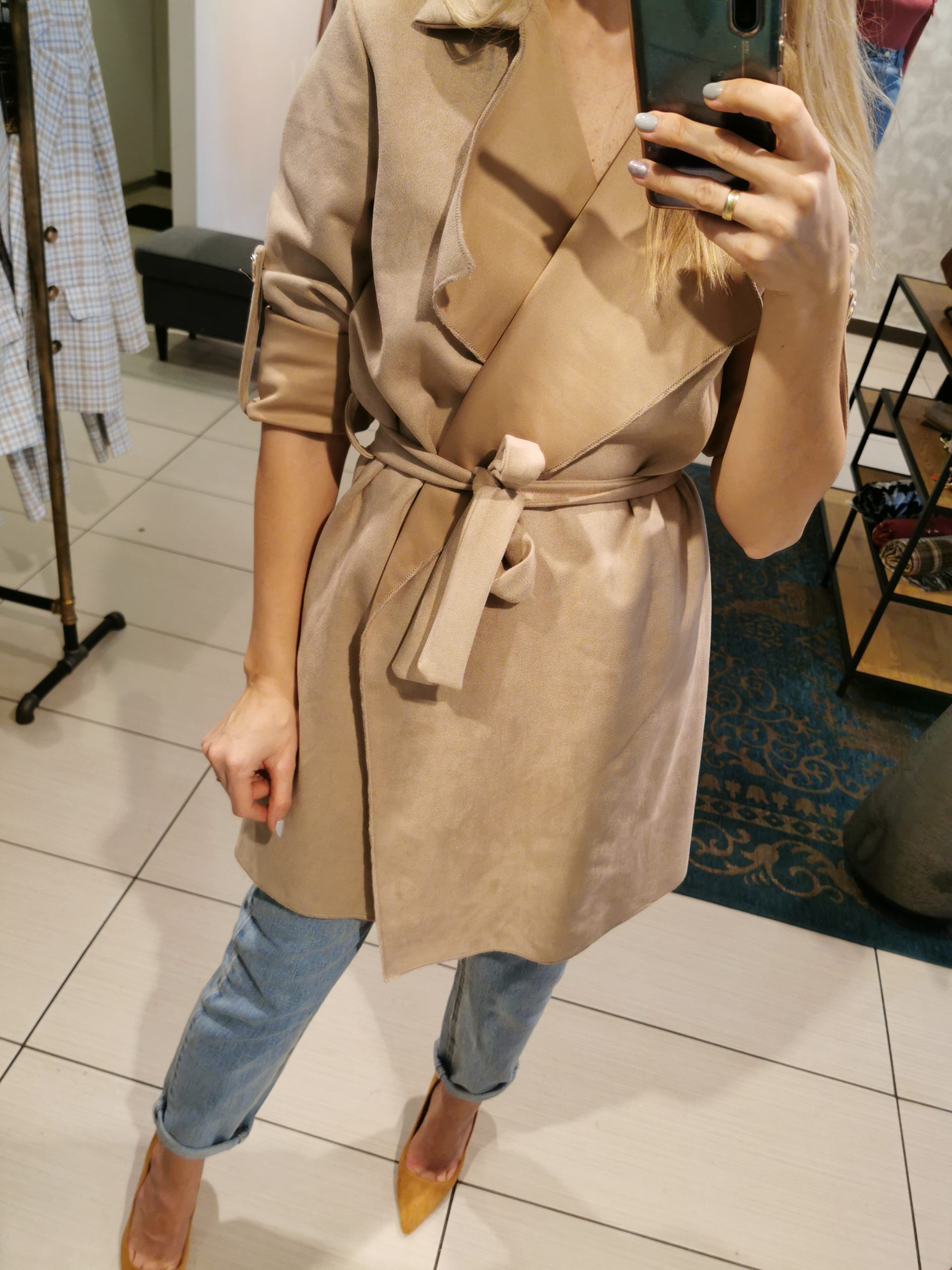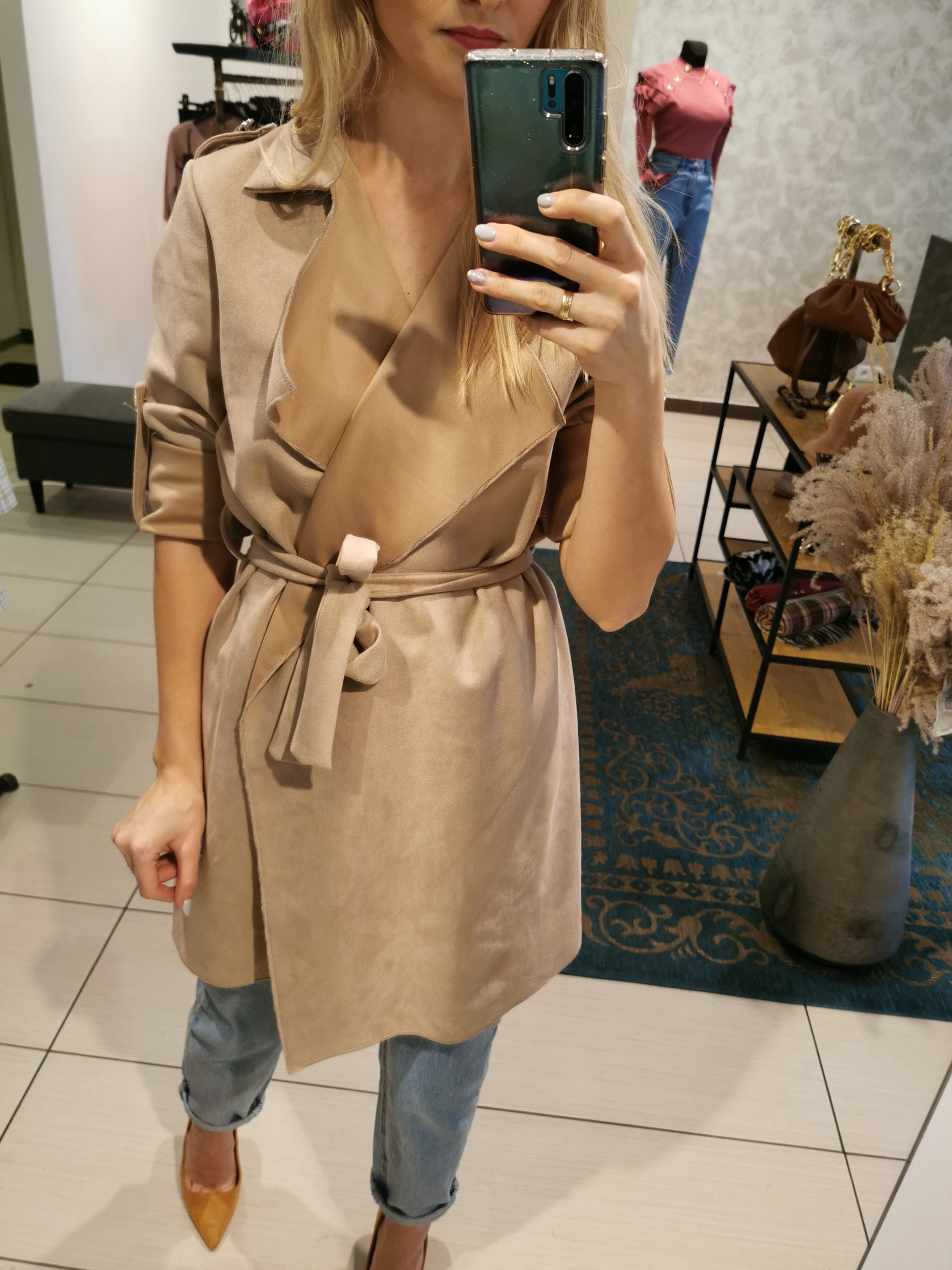 Narzutka w kolorze karmelowym na wiosenne dni. Wiązana w pasie, dwie klapy oraz możliwość regulacji rękawa. Na ramionach ozdobne pagony. Pasuje zarówno do butów eleganckich jak również sportowych. Rozmiar uniwersalny.
