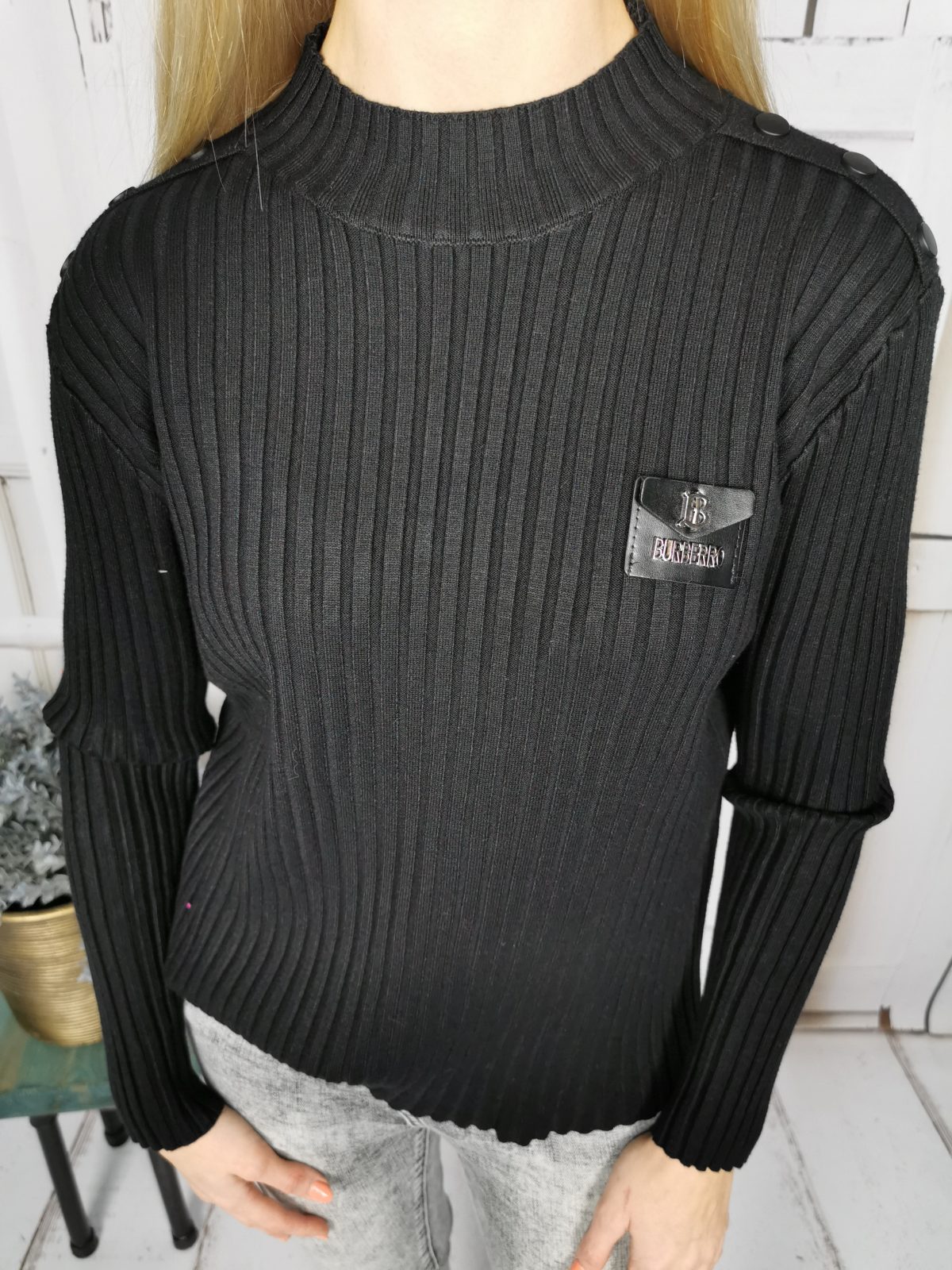 Piękny półgolf z prążkowanej dzianiny w kolorze czarnym. Na ramionach posiada ozdobne czarne guziki. Z przodu na lewej piersi posiada wszytą aplikację z ekoskóry. Bardzo dobra jakość dzianiny.