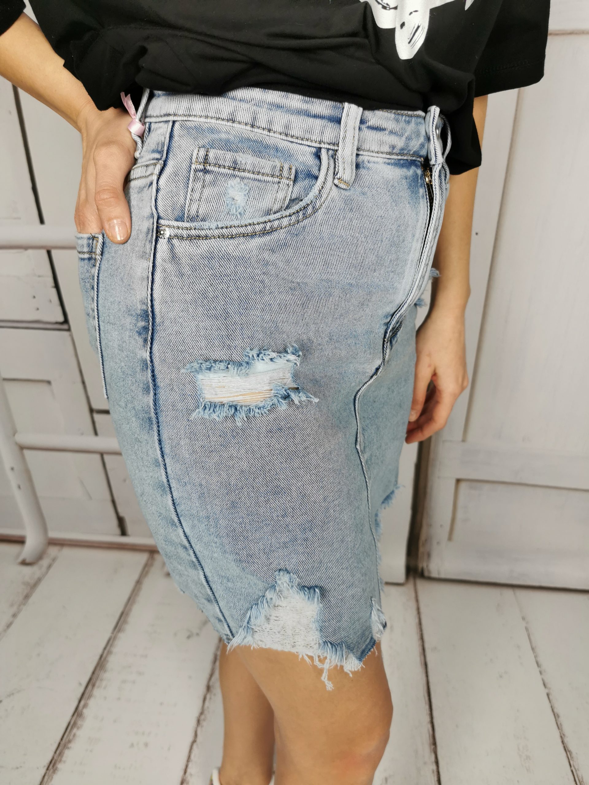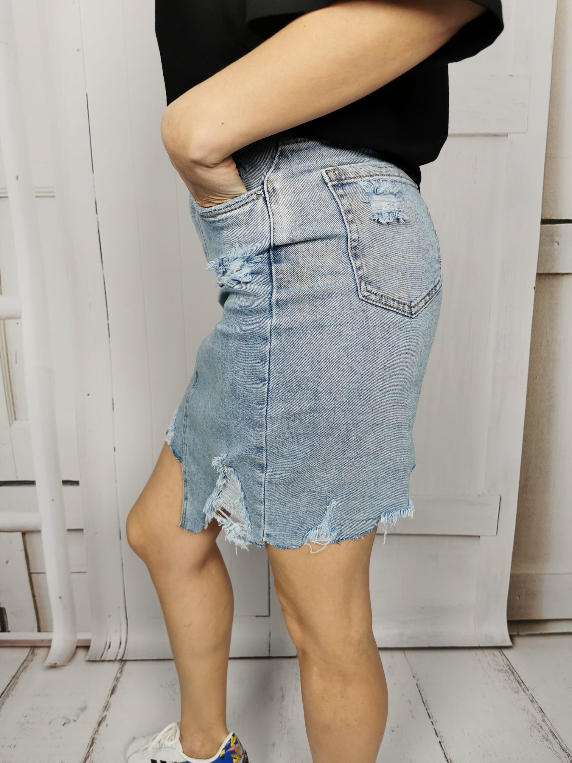 Spódnica jeansowa o kroju ołówkowym. Liczne przetarcia i asymetryczny krój nadają jej niebanalnego charakteru. Posiada dwie kieszenie z przodu i dwie klasyczne kieszenie z tyłu. Zapinana na zamek. Świetnie wpisuje się w trendy sezonu wiosna/ lato 20/21 .