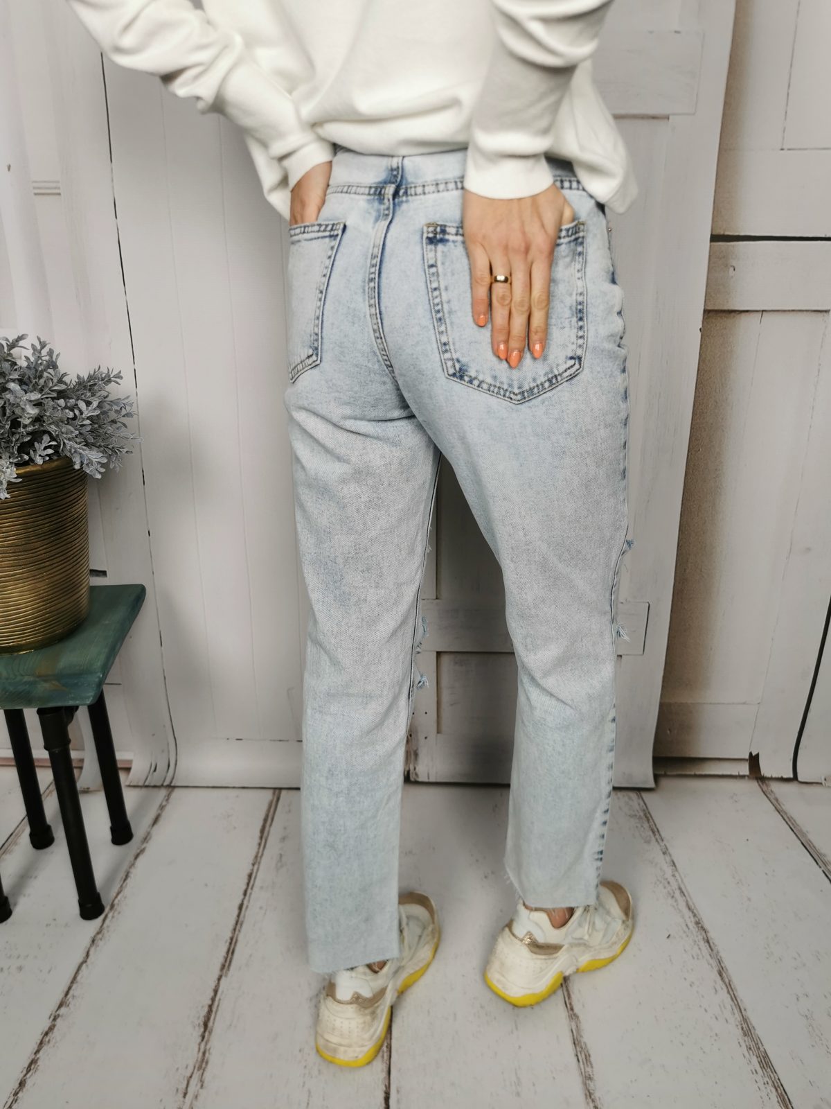 Spodnie z dziurami w kolorze light blue. Posiadają dwie większe dziury na kolanach oraz kilka przetarć, model high waist. Nogawki są poszarpane pozbawione mankietu. Pasują do obuwia eleganckiego jak też sportowego. Model sezonu wiosna/lato 2021.