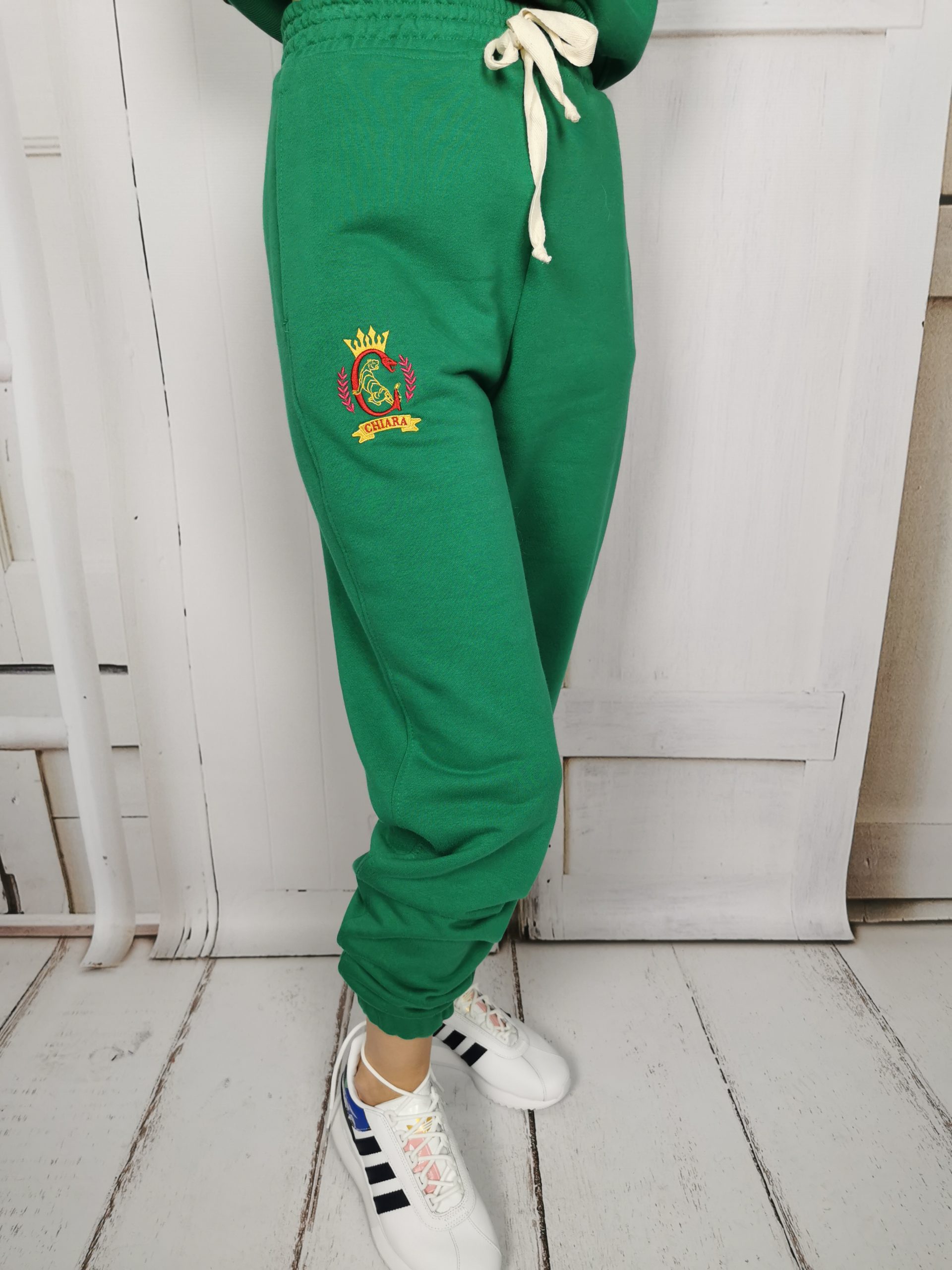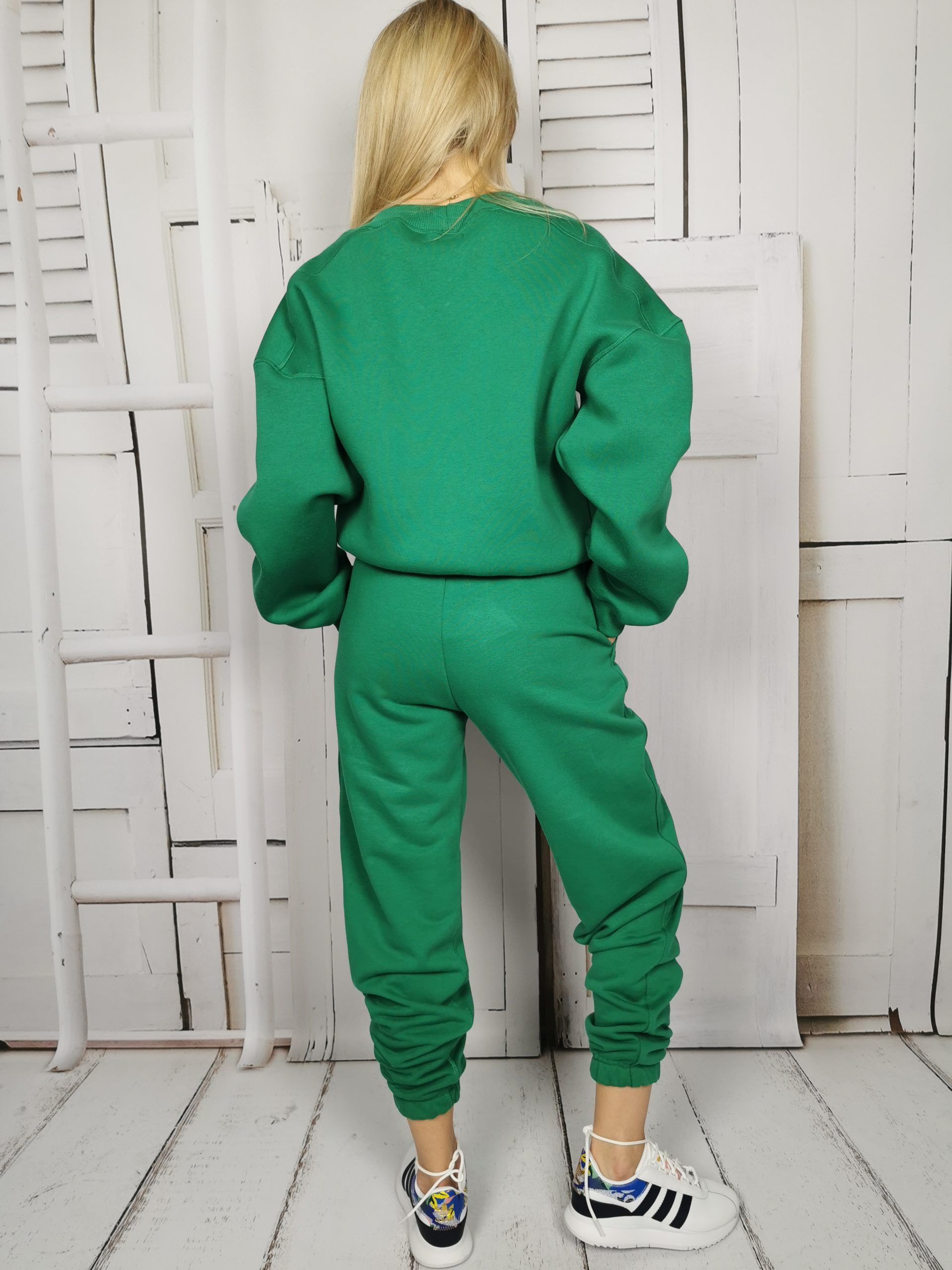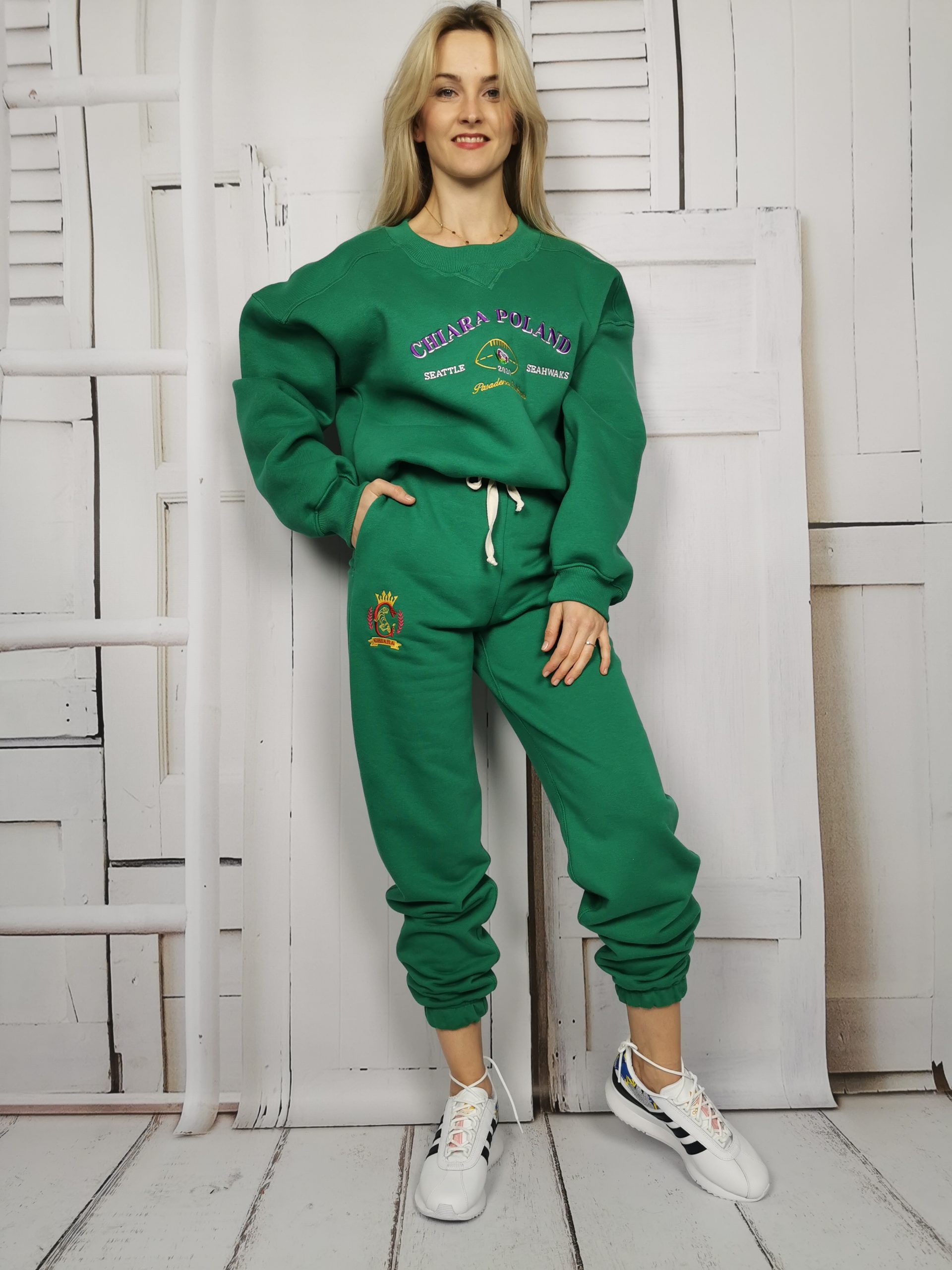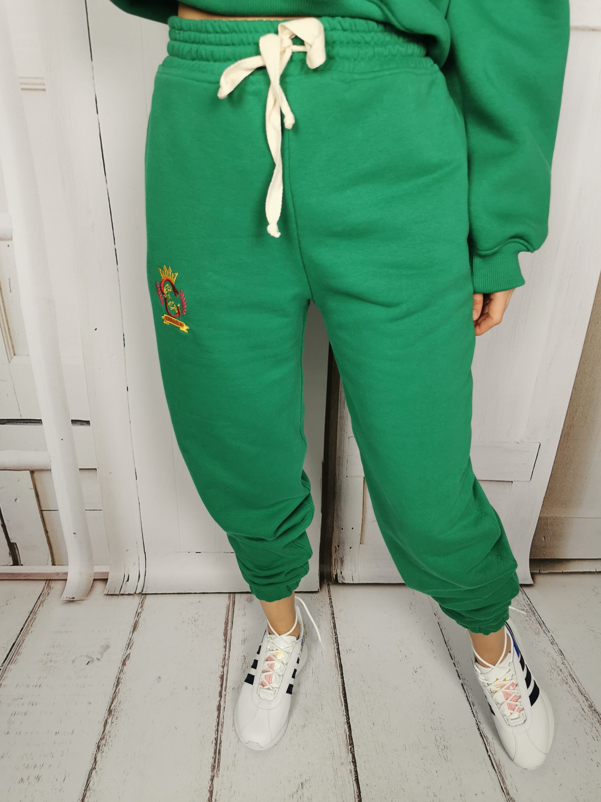 Spodnie dresowe w pięknym kolorze soczystej zieleni. Posiadają gumę w pasie oraz sznurek i dwie kieszenie z przodu. Po lewej stronie przy kieszeni wyhaftowane logo producenta. Nogawki lekko zwężane ku dołowi, zakończone gumą. Piękny komplet tworzy z bluzą w tym samym kolorze. Jakość premium, polska produkcja.
