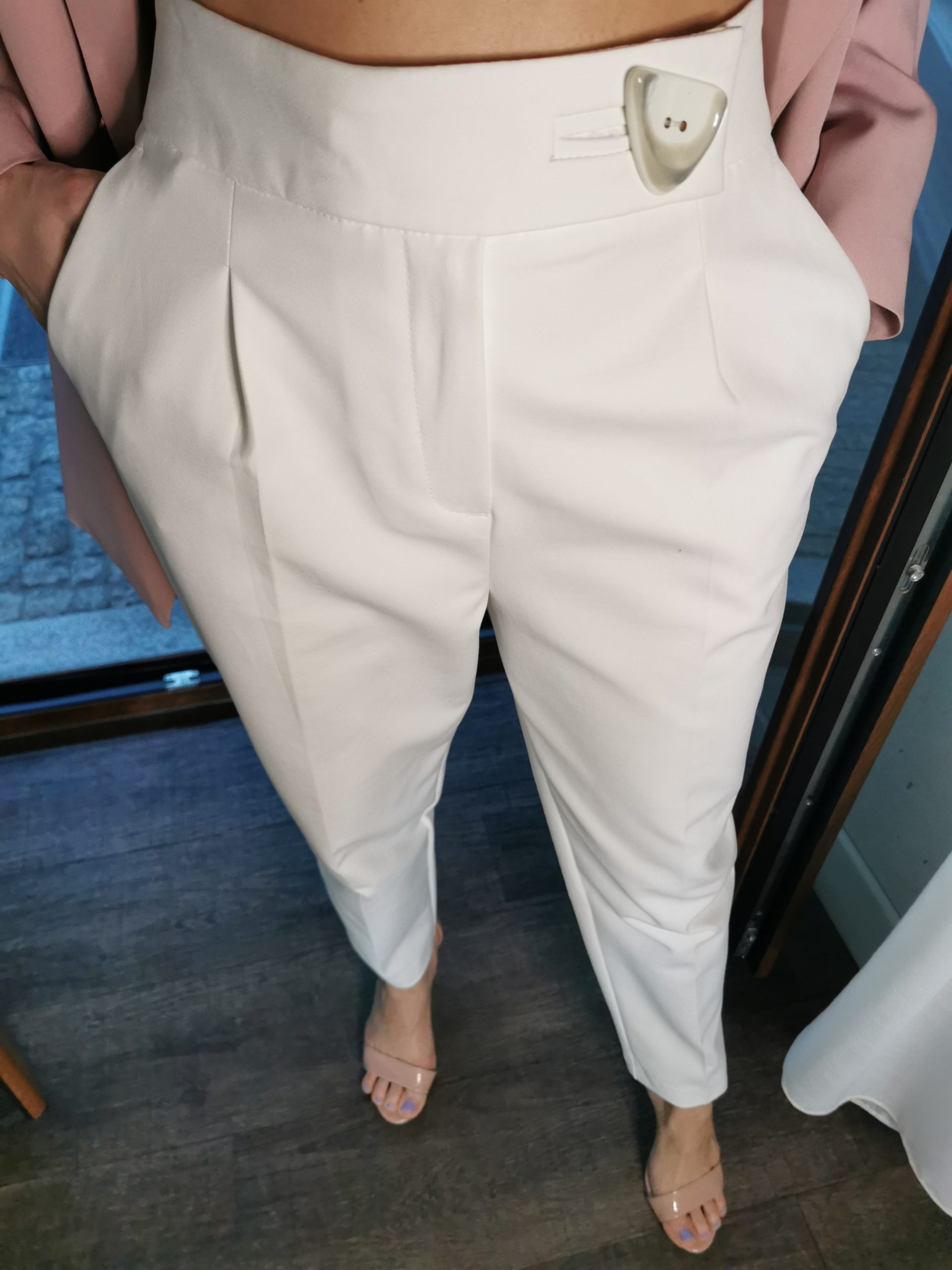 Eleganckie spodnie na kant w kolorze białym. Nogawki proste, lekko zwężane ku dołowi a la cygaretki. Zapinane na zamek a w pasie posiadają dodatkowo ozdobny bambusowy guzik. Klasyka oraz ponadczasowość – założysz do marynarki, koszuli, eleganckiego topu czy sweterka. Rozmiarówka zawyżona – rozmiar 36 to typowe 38.