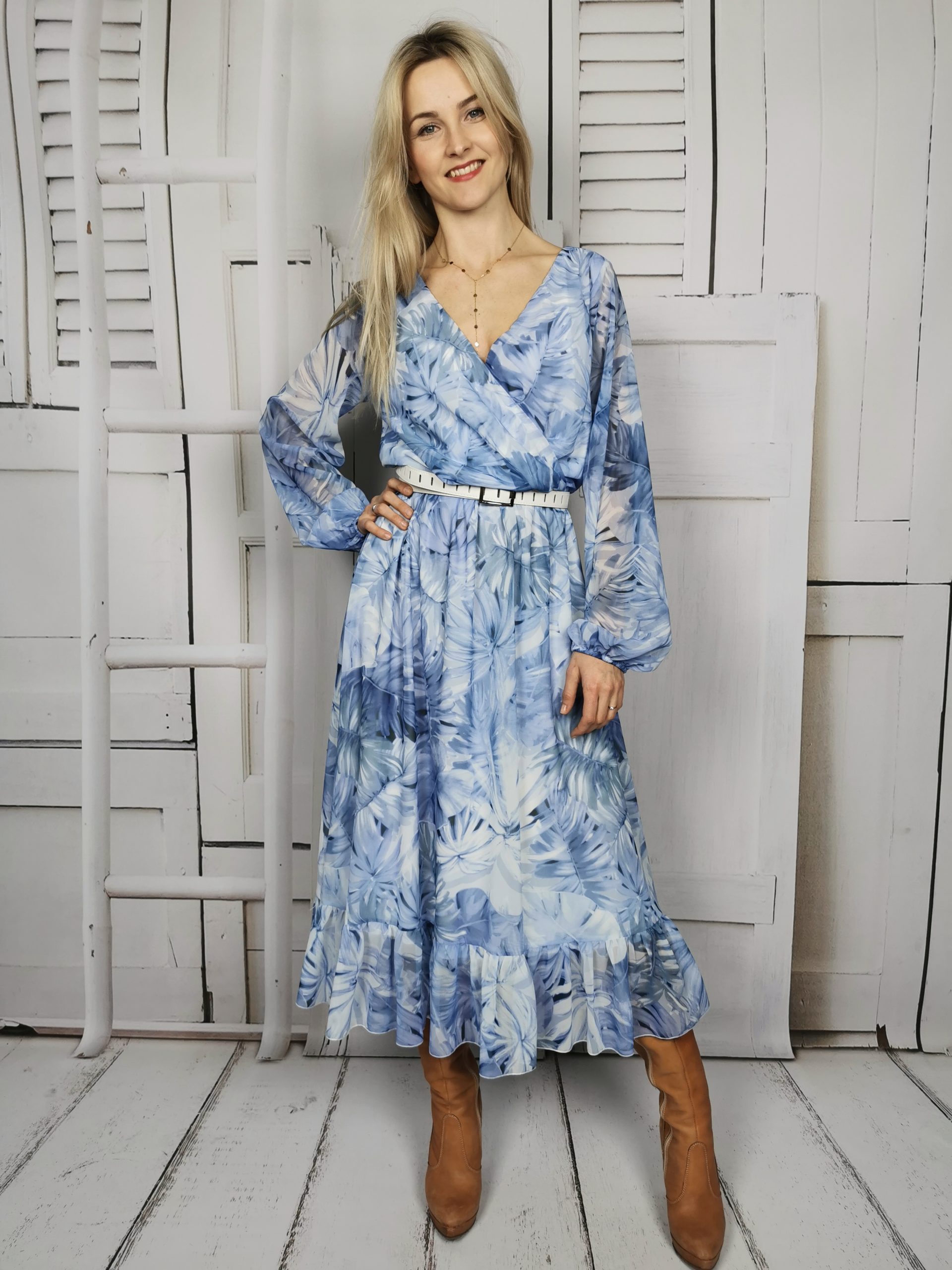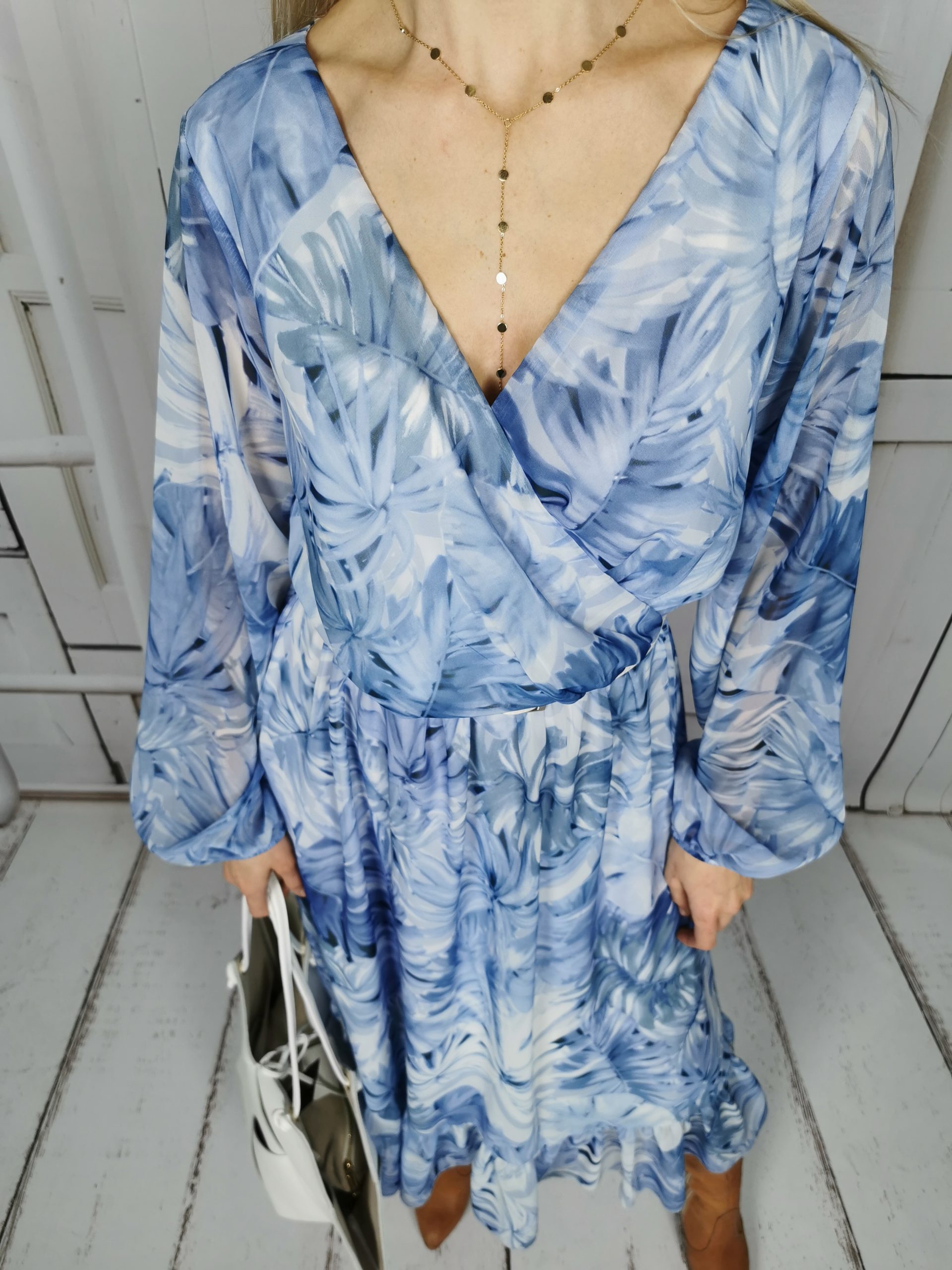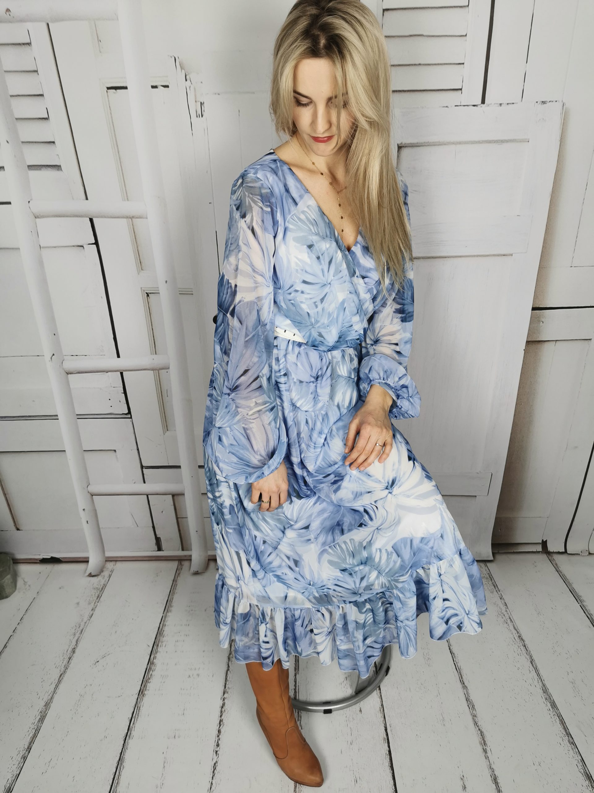 Sukienka w modnym tego sezonu kolorze baby blue. Posiada lekko bufiaste rękawy, dekolt w literę V. Sukienka posiada w pasie gumę wewnątrz ma wszytą podszewkę. Na dole wykończona jest delikatną falbaną. Sukienka polskiej produkcji . Możesz założyć ją do eleganckich szpilek lub botków jak również do jeansowej katany i trampek.