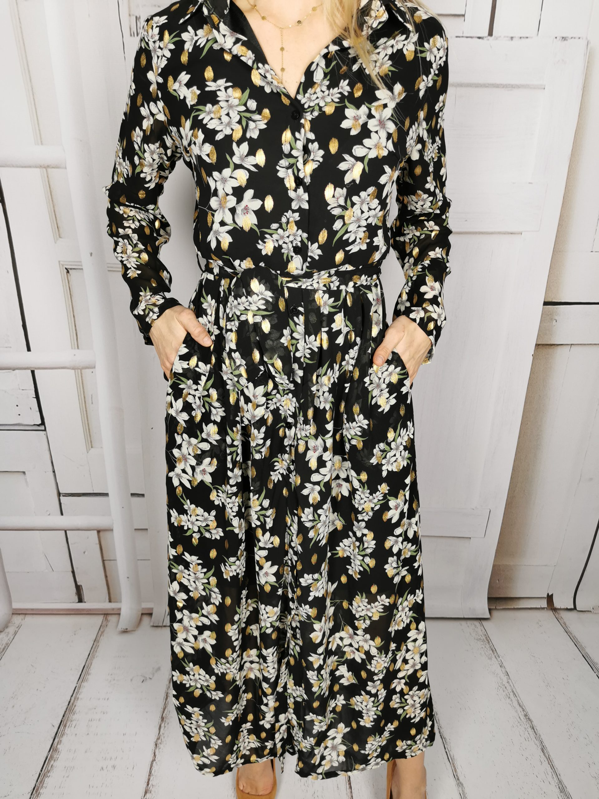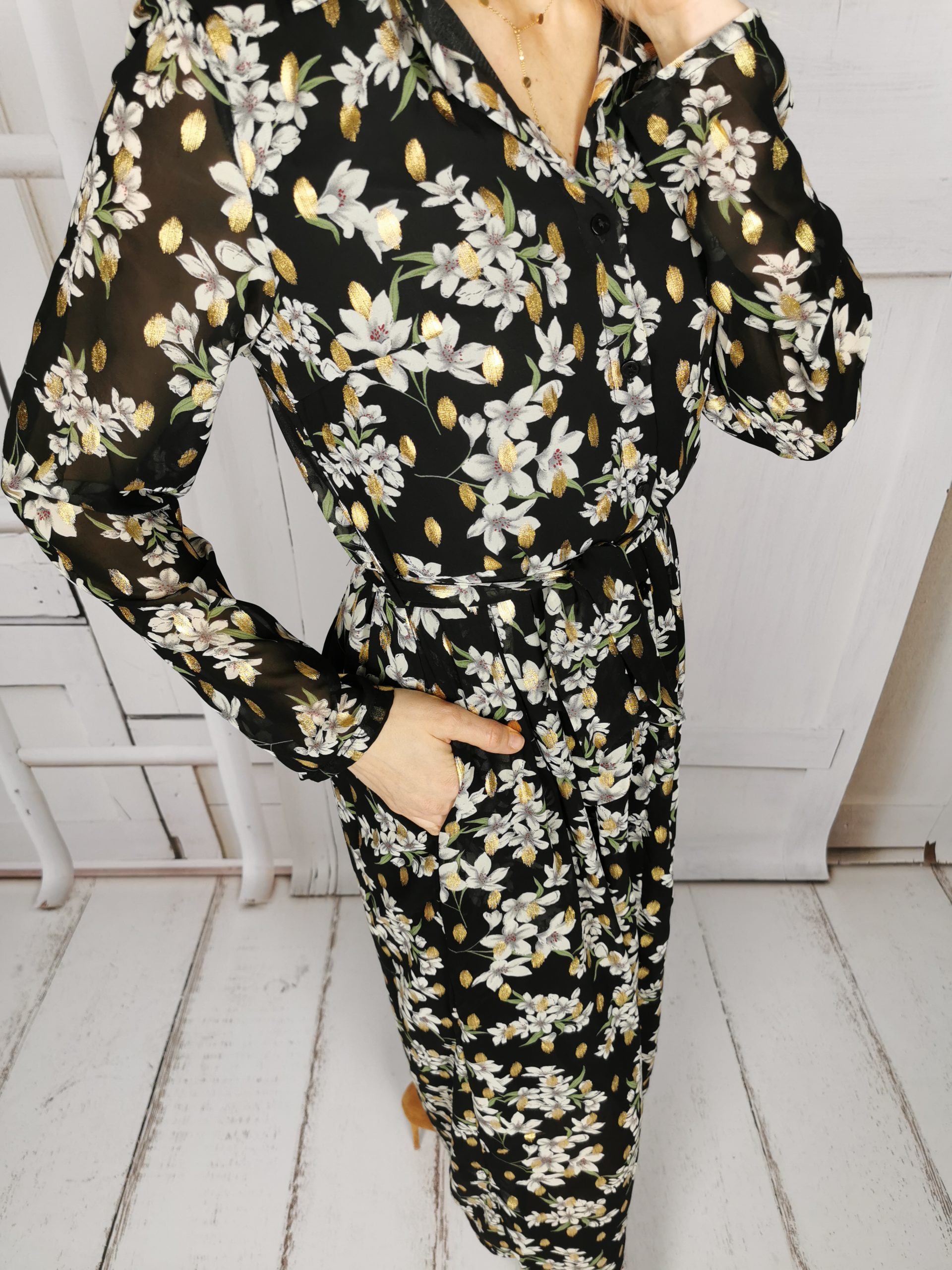 Sukienka szmizjerka w kolorze czarnym, wiązana w pasie oraz zapinana na guziki. Długi prosty rękaw, wzór w kwiaty nakrapiany delikatnym złotem. Sukienka posiada dwie kieszenie. Idelana do kozaków jak równiesz szpilek.