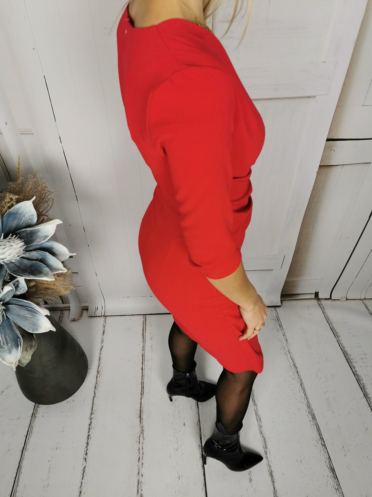 Klasyczna i elegancka sukienka z dzianiny. Posiada dekolt w literę V i jest odcinana w pasie oraz wiązana dodatkowym paskiem z dzianiny w tym samym kolorze. Z tyłu posiada łączenie na plecach. Świetnie przylegająca do ciała i delikatnie rozciągliwa.