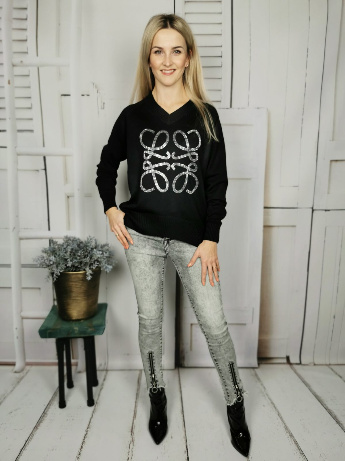 Piękny bawełniany sweter bardzo delikatny i miły w dotyku. Przedstawia całą paletę barw, nietypowy wzór. Rękawy reglanowane wykończone srebrna nitką jak również krawędź dolna swetra oraz dekolt.