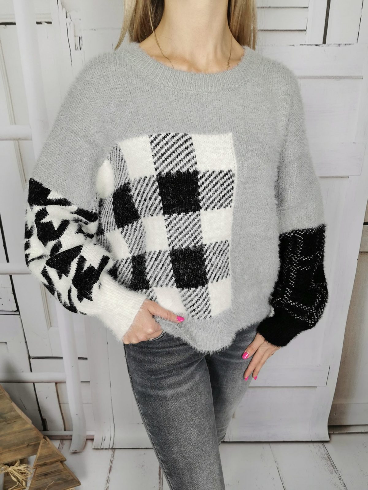 Miły w dotyku i ciepły sweter a l’a alpaka w kolorze szarym. Posiada niebanalne połączenie klasycznego i wiecznie modnego wzoru pepitki i szachownicy. Jeden rękaw w ciemniejszym kolorze. Z przodu duży nadruk szachownicy.