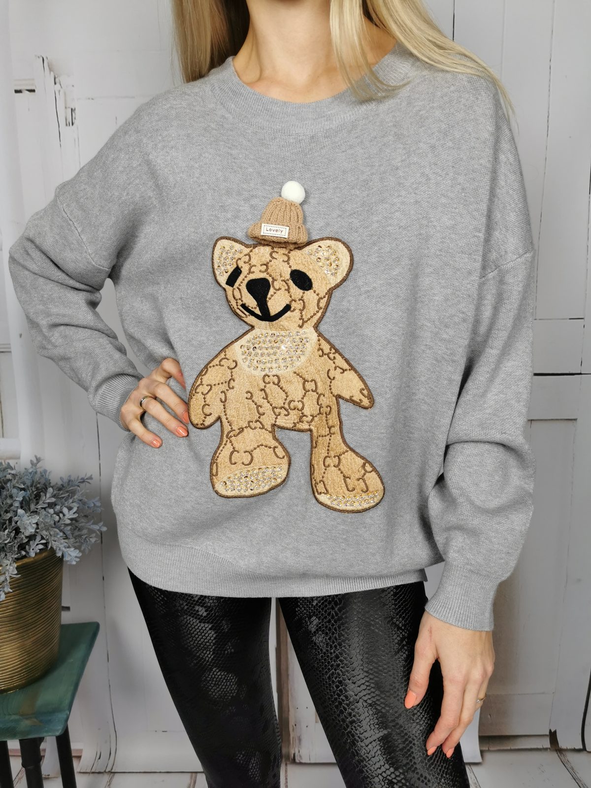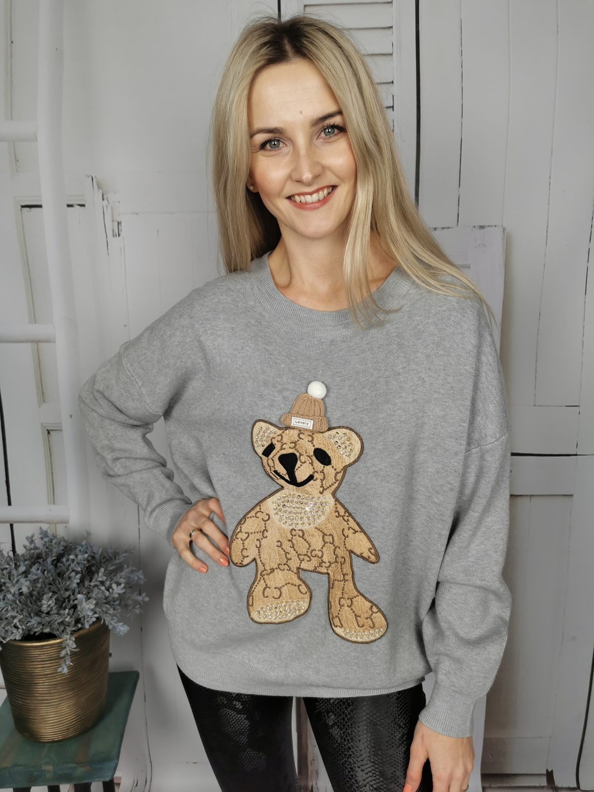 Sweter w kolorze szarym, posiada wyszywaną aplikację w postaci misia z czapką. Dekolt standardowy, rodzaj rękawa reglan.