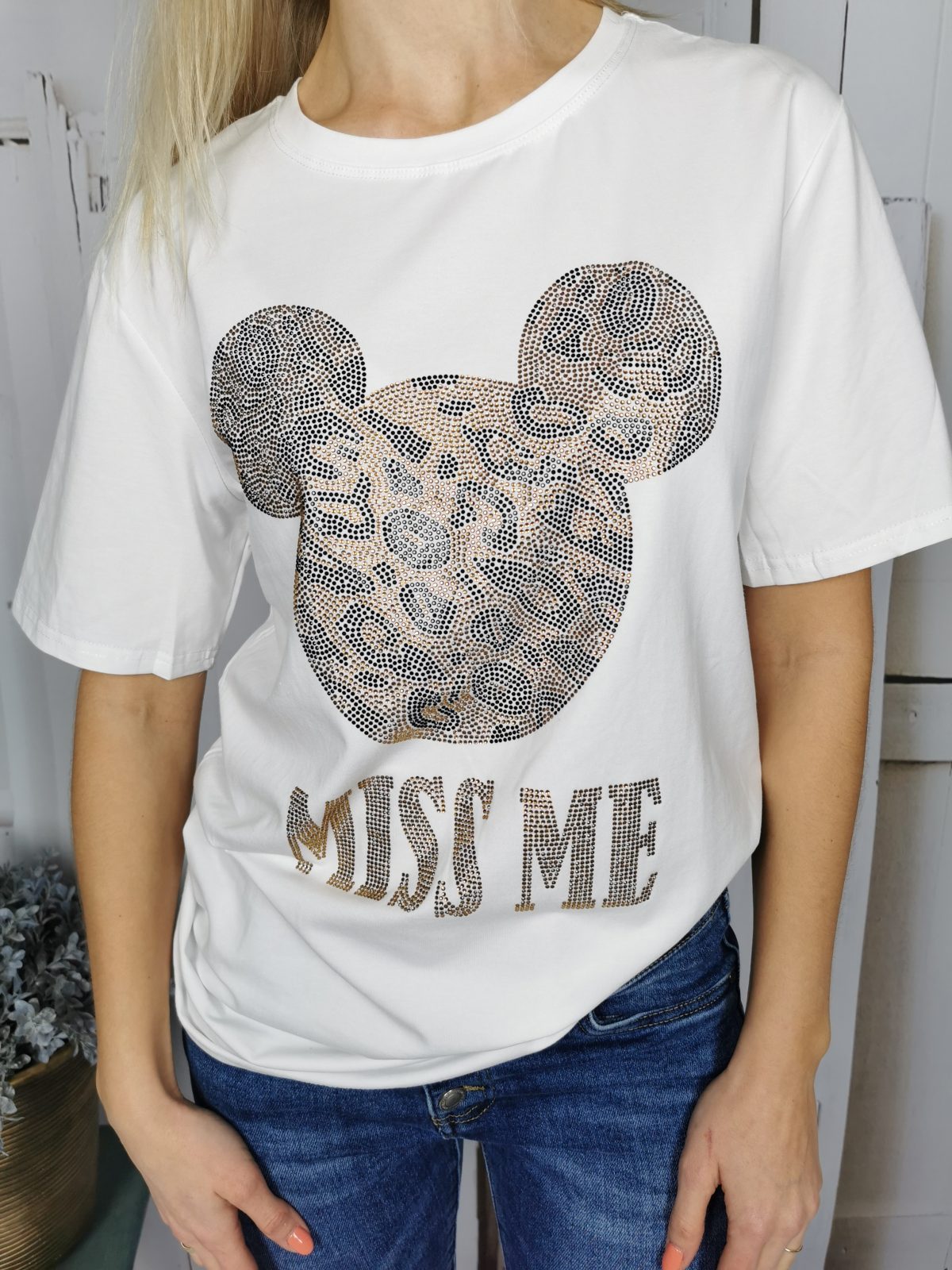 Bawełniany T-shirt w kolorze białym z motywem Myszki Miki. Aplikację tworzą małe błyszczące cekiny. Dodatkowo pod aplikacją znajduje się napis MISS ME. Standardowa rozmiarówka.