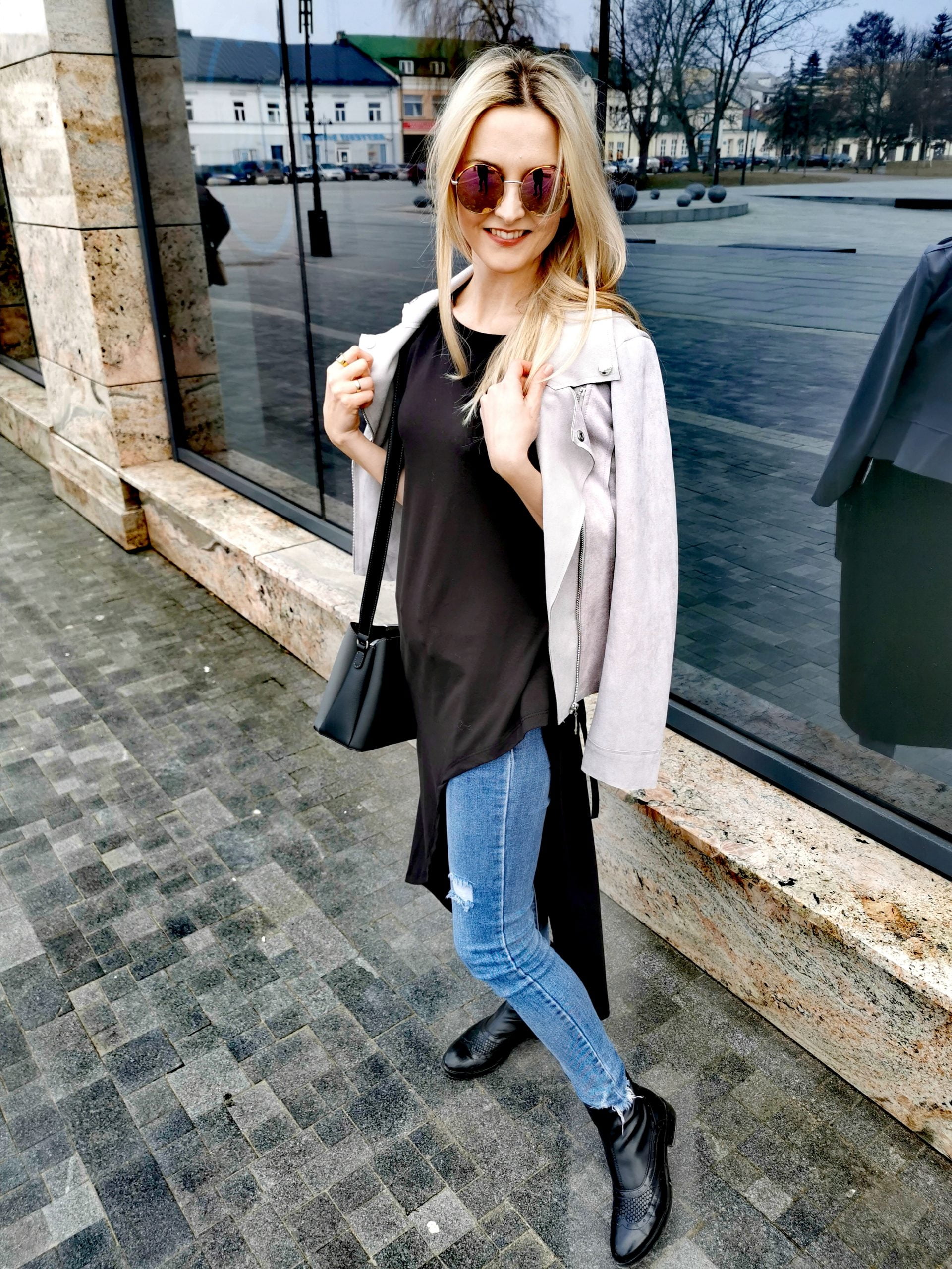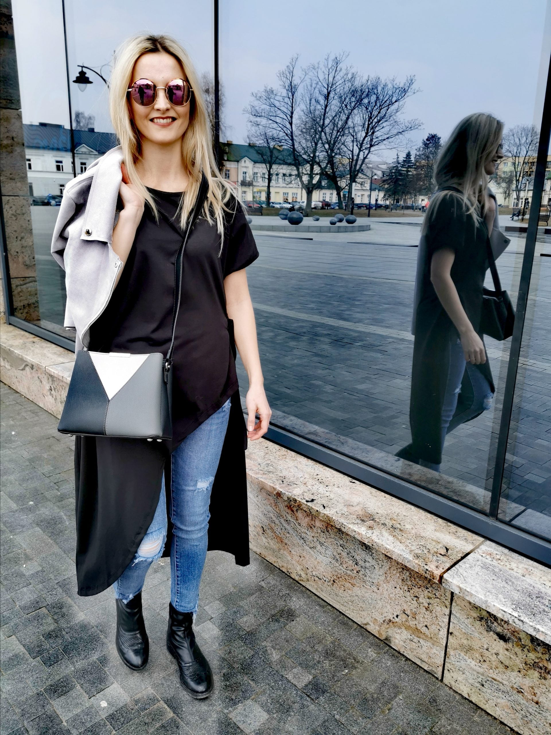 Długa, bawełniana tunika w czarnym kolorze na krótki rękaw. Jest nietypowa ze względu na swą długość oraz asymetryczny krój. Pozbawiona aplikacji. Na lewym boku znajduje się sznurek ,dzięki czemu możesz sama regulować obwód talii. Tunika jest w rozmiarze uniwersalnym, zwiewna i lekka w sam raz do codziennych stylizacji.